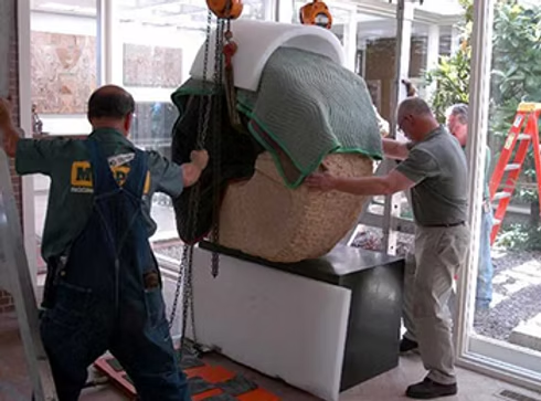 Derek Uhlman with a rigging crew installing “Stone of the Sun” in the Philip Johnson designed home of Bob and Carolyn Nelson, Wayzata, MN, 2007